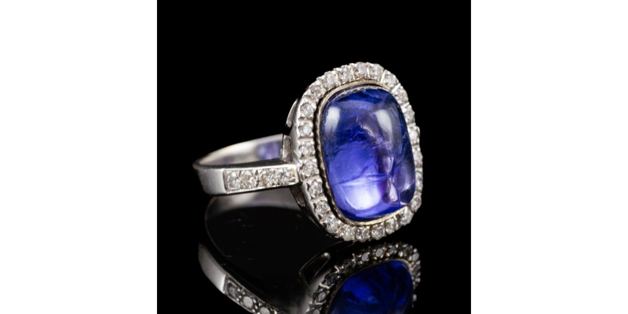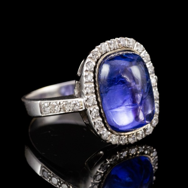 Modern rozetta fazonú, 14 karátos fehérarany gyűrű, bruttó tömege: 6,53 gramm. Lekerekített téglalap alakú gyűrűfej közepében 1 nagyobb, kabochon csiszolású tanzanit Cca. 5 ct; körülötte, valamint a gyűrűvállakon mindösszesen 32 darab apró, modern briliáns csiszolású gyémánt ékítéssel Cca. 1,20 ct. (M1; Cr;Vs-Si) Jelzett: 2016-tól használatban lévő magyar fémjellel. Gyűrű mérete:54.