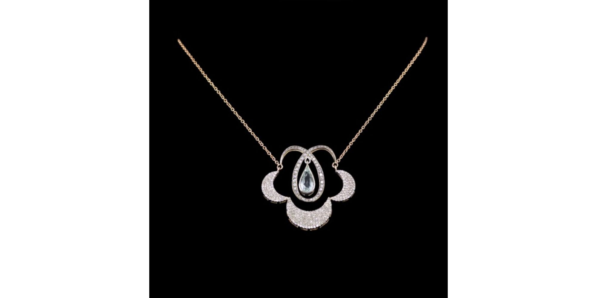 Anker szemezésű, 56 Zolotnyikos arany nyakláncon ötkaréjos virág-szerű medál, Bruttó tömege: 9,4 gramm. Teljes hossza: 47 cm. Nyakék közepében 1 nagyobb, csepp formára csiszolt akvamarin kő Cca.1,72 ct; valamint sok apró Achtkant csiszolású gyémánt ékítéssel Cca.1,10 ct. Jelzés nélkül.