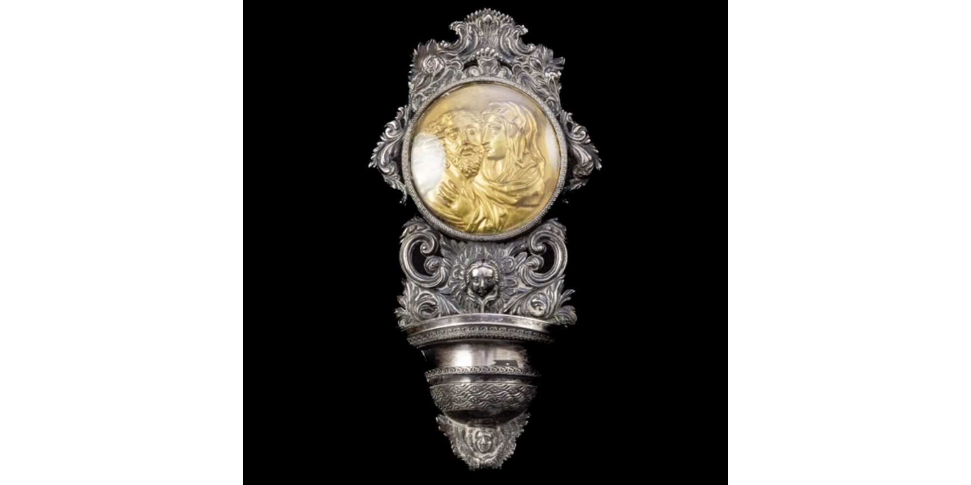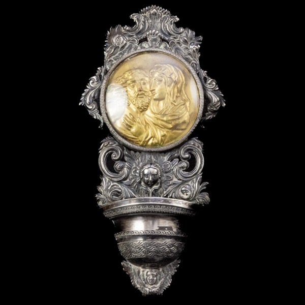 Préselt, patinázott ezüst fali szenteltvíztartó akantusz levél és angyal ábrázolású kerettel, benne üveg alatt aranyozott vörösrézből készült, préselt Krisztus és Mária arcképével díszített medalionnal. Bruttó tömege: 98,8 gramm. Méretei: 21 x 11 x 3,5 cm. Jelzett: 1810-1872 közötti antik olasz fémjellel.