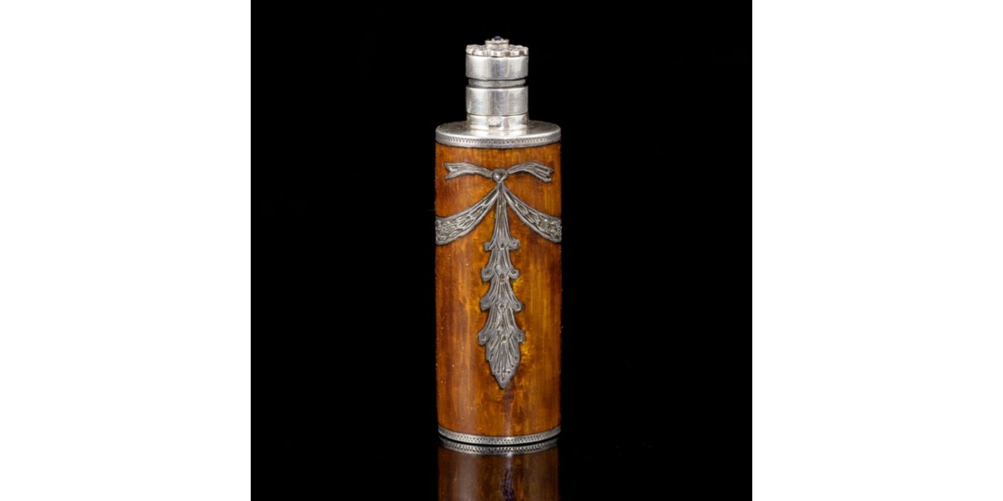 Cylindrical silver perfume bottle of 88 Zolotnyik fineness. Amber brown, transparent luster enamel surface, with a mantle decorated with classicist-style silver lace. Its screw-lock cap is decorated with a ruby-diamond rosette. Gross weight: 39 grams, dimensions: 6.5 x d:2 cm. Marked: 88 Zolotnyik silver, with the Russian hallmark used between 1896-1908.