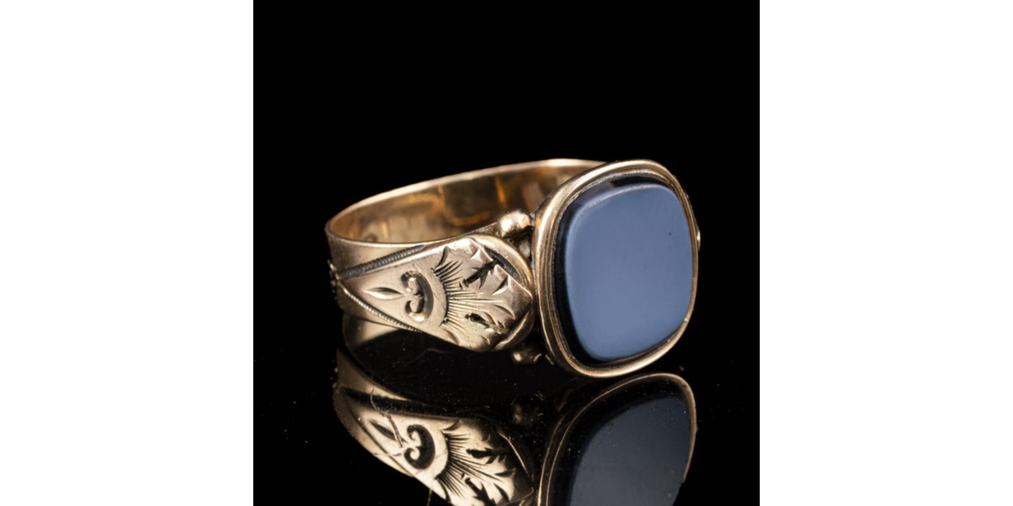 14 K gold signet ring (still engravable), rounded square shape, with a gray agate plate, 6.6 grams. The ring shoulders are decorated with an acanthus leaf pattern. Marked: Viennese hallmark used between 1872-1922. Ring size: 58.