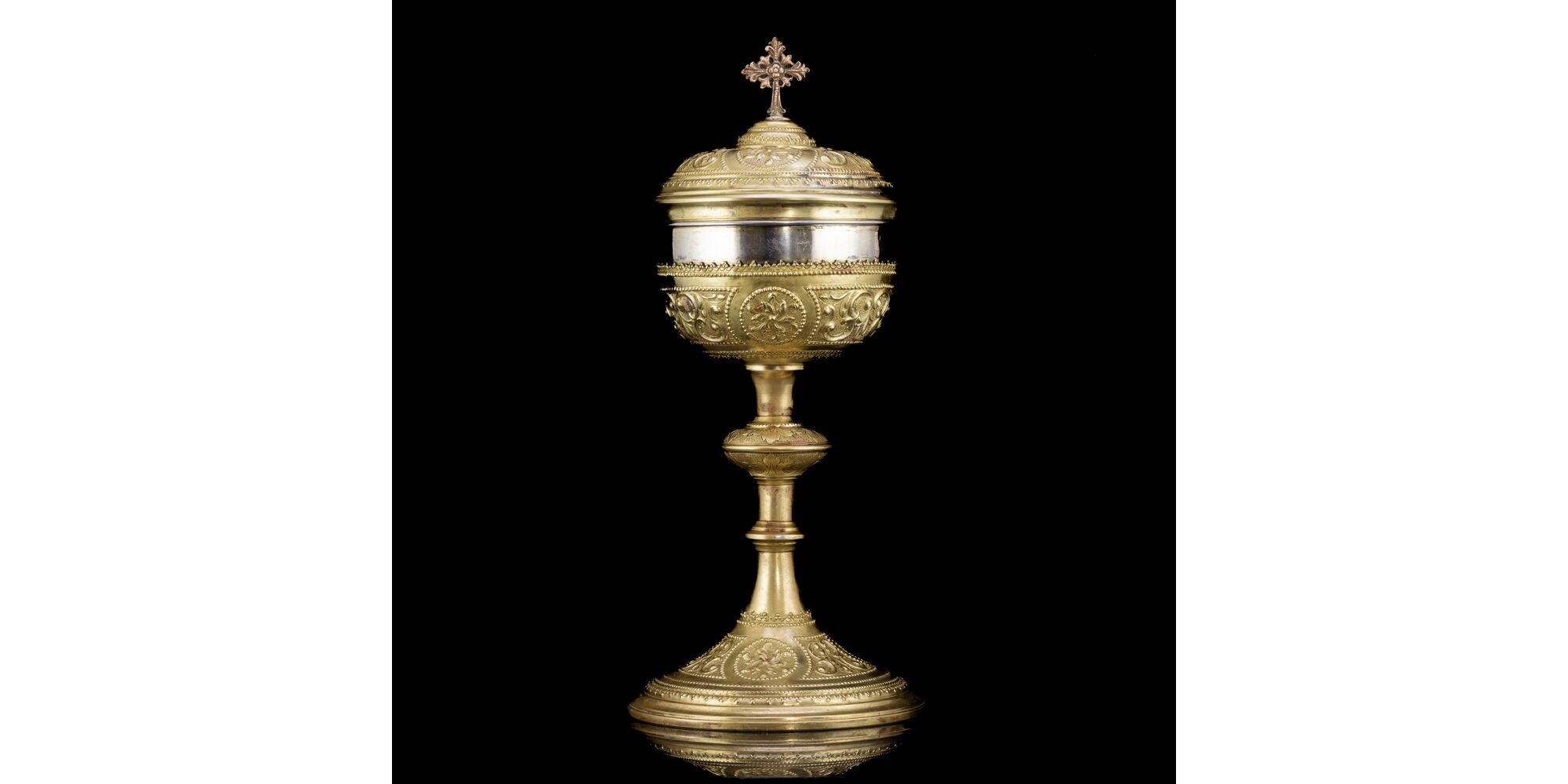 Sárgaréz(ötvözet) cibórium, 800-as finomságú ezüst ostyatartó kehellyel. Kerek talpról felhúzott, nódusszal tagolt szár, és kehely fedéllel. Fedélének tetején vörösréz kereszttel. Méretei: 32 x d: 14 cm. Ezüst kehelyben jelzett: 1867-1936 között használt pesti fémjellel.