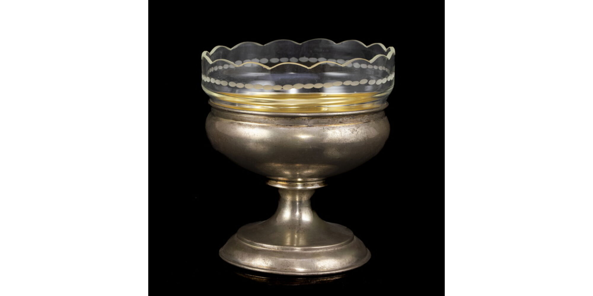 800-as finomságú ezüst, nettó tömege: 117,7 gramm, méretei: 11,5 x d:10,5 cm. Kerek talpon, gömbölyded forma kínálórésszel, amely belül tüziaranyozott. Homokfúvott csillagmintázatú pótolt üvegbetéttel. Jelzett: Bécs, 1855-fémjellel.