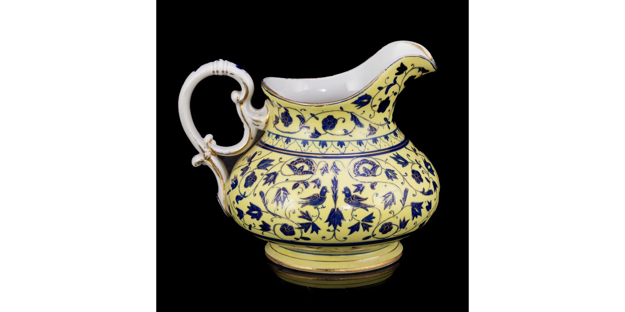 Citromsárga alapon kobaltkék apró növényi indás, virágos dekorral, madárkákkal festett, aranykontúrozott porcelán tejkiöntő. Méretei: 12,5 x 15 cm. Jelzés nélkül, masszába benyomott 27 formaszámmal. Feltehetően Cseh porcelán manufaktúrából, XIX. század vége.