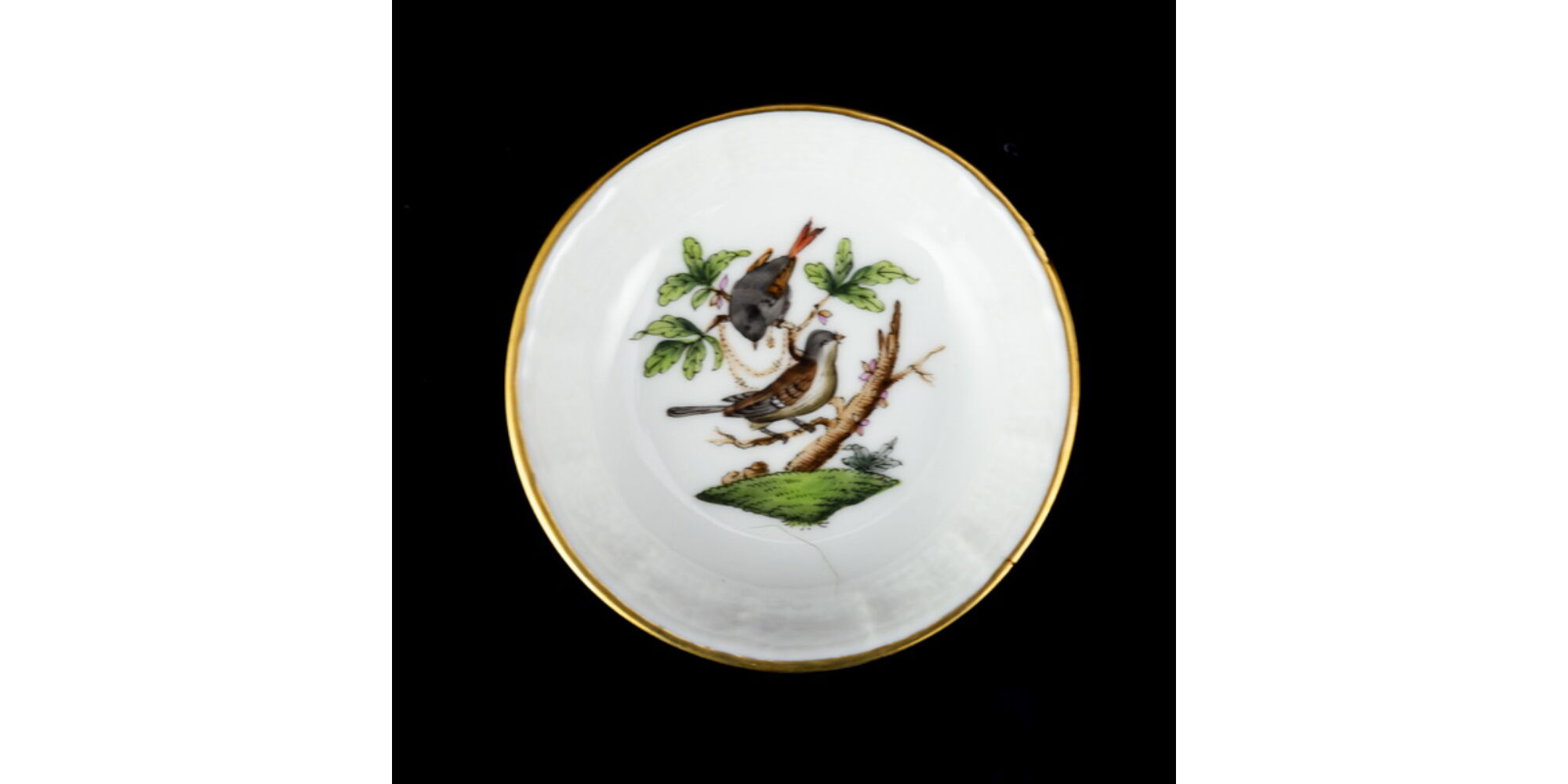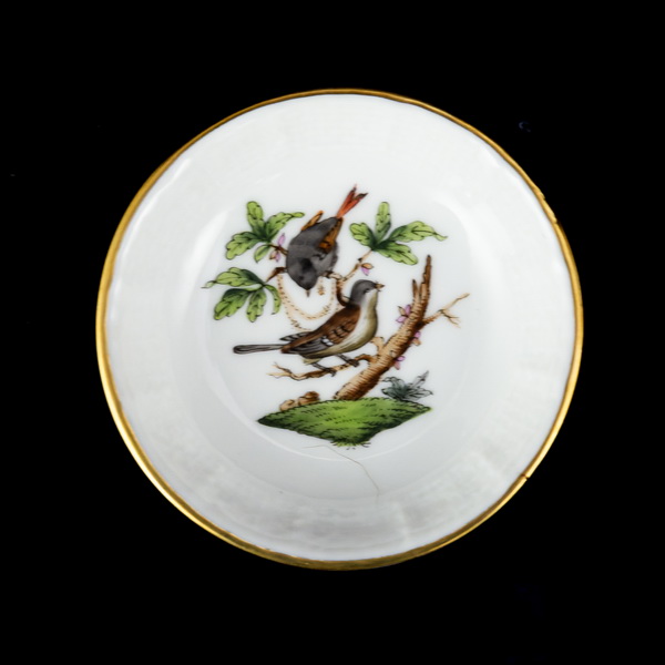 Rotschild dekorral festett, aranykontúrozott RO Rotschild mintás kistálka, mérete: d:7 cm. Jelzett: XX. század második fele Herendi márkajelzéssel, 681/RO formaszámmal.