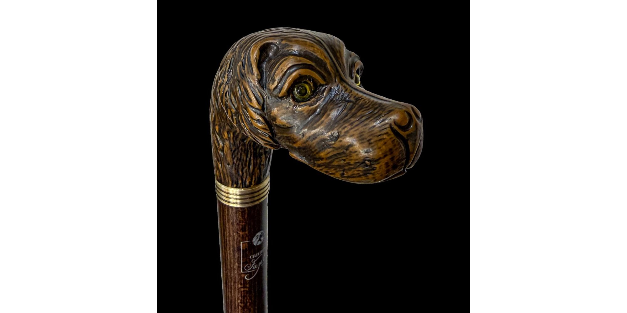 Mahagóni sétabot kutyafejet formázó, festett műgyanta markolattal, festett üveg szemekkel. Hossza: 103 cm. Jelzett: Fayet Cannes jelzéssel. Modern.