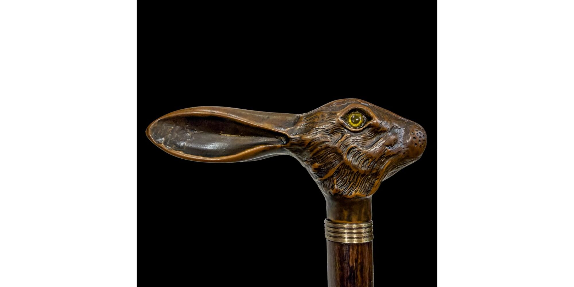 Mahagóni sétabot nyúlfejet formázó, festett műgyanta markolattal. Hossza: 102 cm. Jelzett: Fayet Cannes jelzéssel. Modern.
