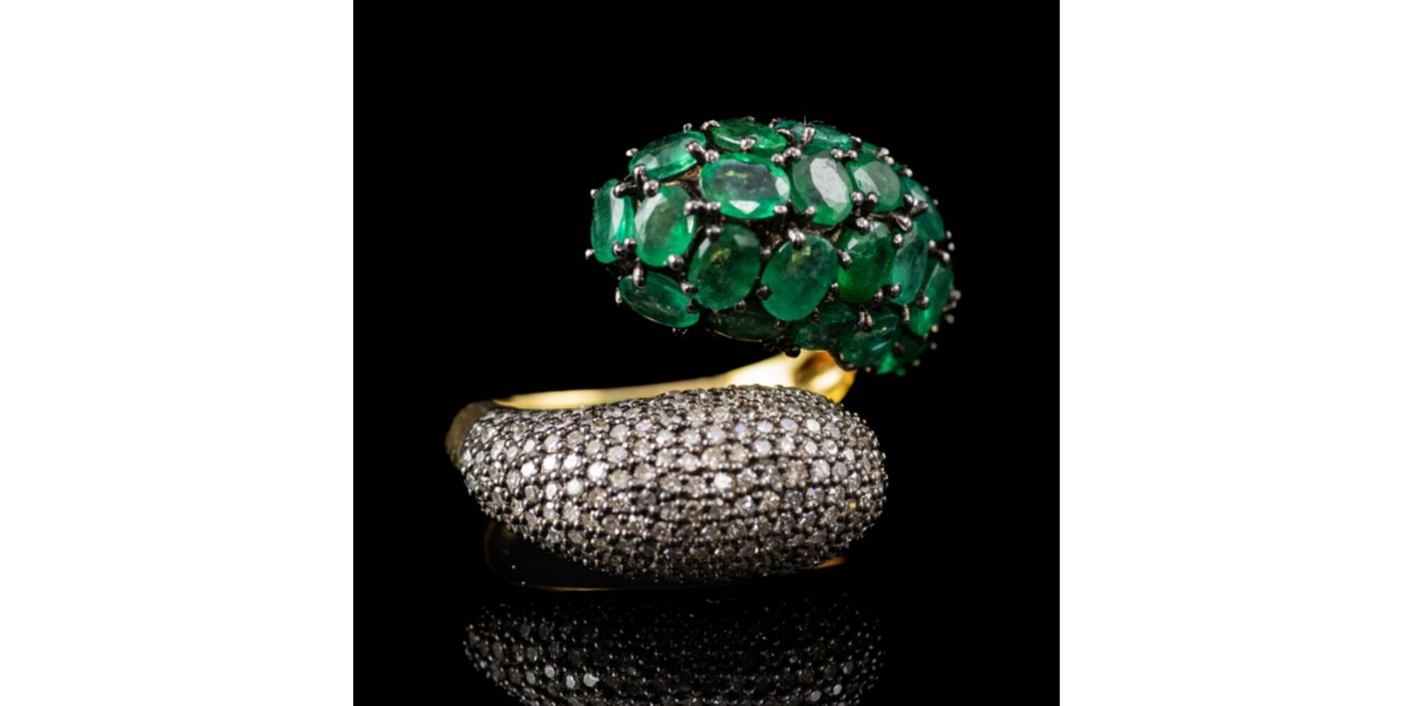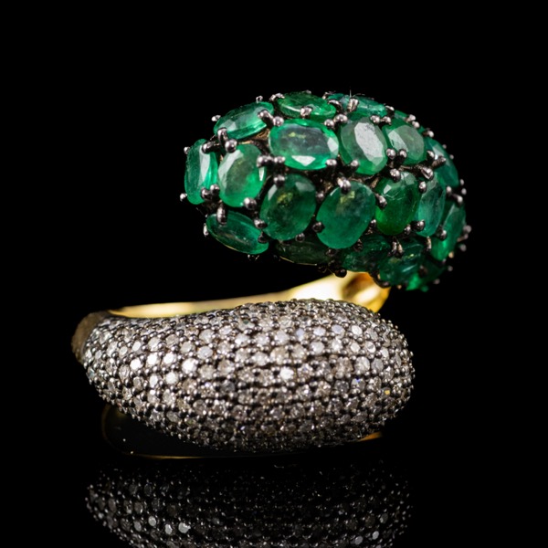 14 karátos arany, Bruttó tömege: 6,9 gramm. Nyitott gyűrűsín, dupla csepp alakú gyűrűfej egyik felében karmos foglalatban 24 darab ovál formára fazettált Smaragd Cca. 3,73 ct. másik felében apró Achtkant csiszolású gyémánt ékítéssel Cca.0,77 ct. Jelzett: 14k. Gyűrű mérete:54-55.