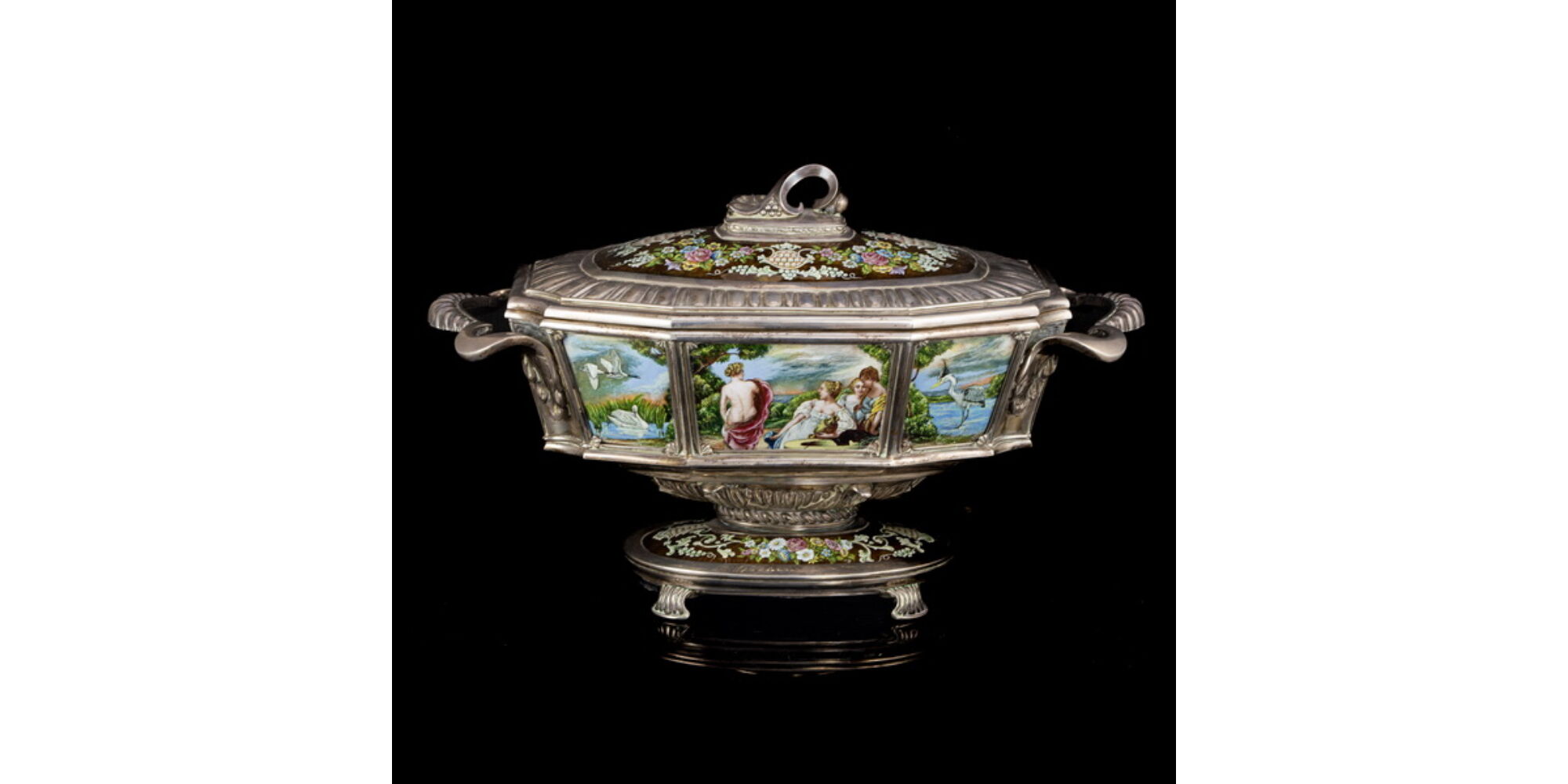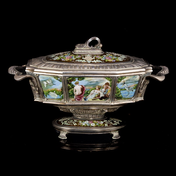 Standing on four legs, on an oval-shaped base, double-walled soup bowl with a lid. The base and lid are decorated with hand-enamelled flower bouquets and grapevine patterns, while the side walls of the bowl, divided by cassettes, are made special and unique by archaic life scenes. Gross weight: 6687 grams. Overall size: 30 x 51 x 23 cm. Marked: Domenech mark engraved into the material, 915 fineness mark.