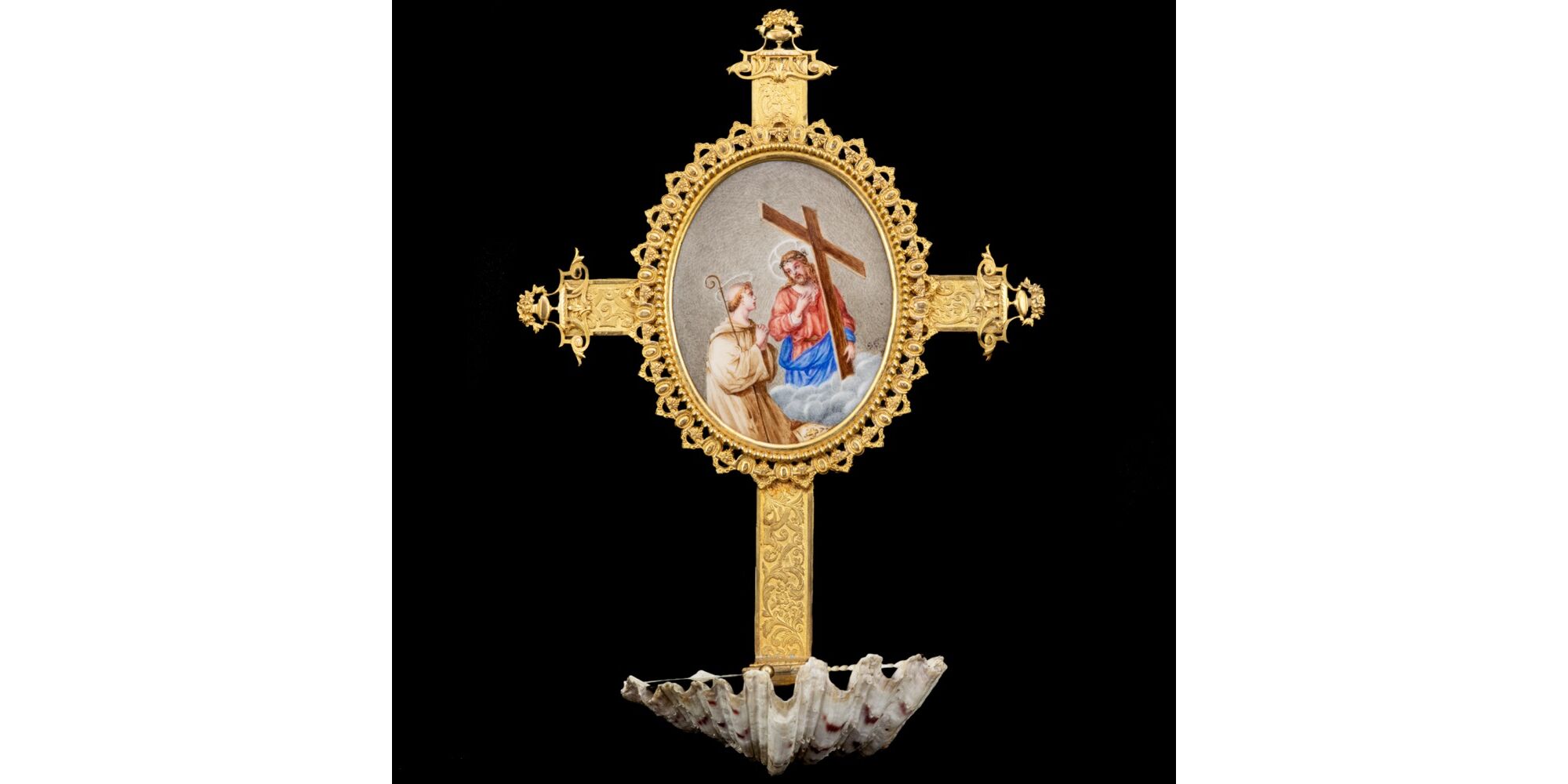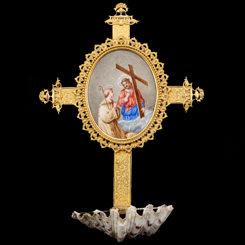 Fire-gilded copper alloy with a hand-painted porcelain medallion on a cross and a water cup made of scallop shell, with lid. Overall size: 28.5 x 19.5 x 8 cm. With openwork decorations at the ends of the cross, with a detailed painted depiction of Christ and Saint Francis (of Assisi) in the medallion. 19th century, presumably Italy.