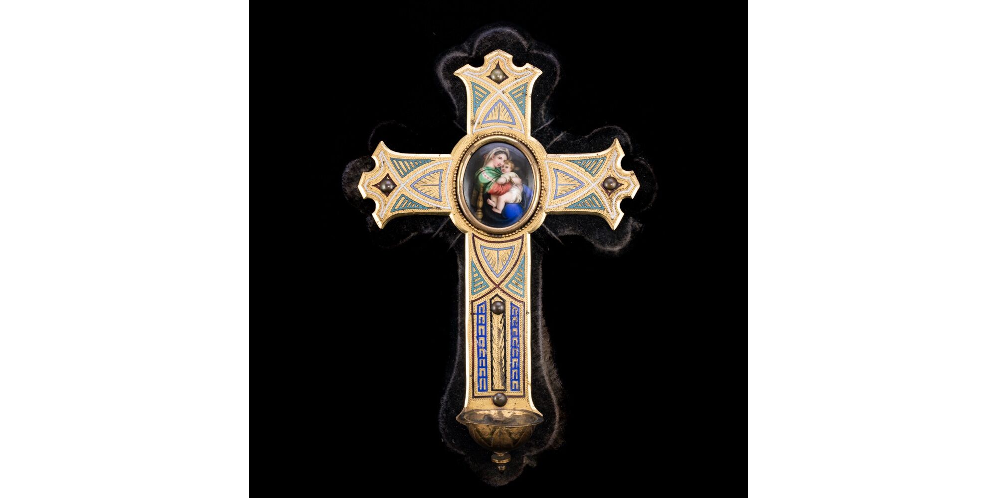 Aranyozott bronz szenteltvíztartó kereszt színes hidegzománc díszítéssel, közepén Raffaello Széken ülő Madonna festményének ovális, porcelánra festett másával. Feltehetően XIX. század vége, olasz vagy francia műhely. Fekete bársony borítású fa lapra rögzítve. Teljes méret: 31 x 22 cm. Jelzés nélkül.
