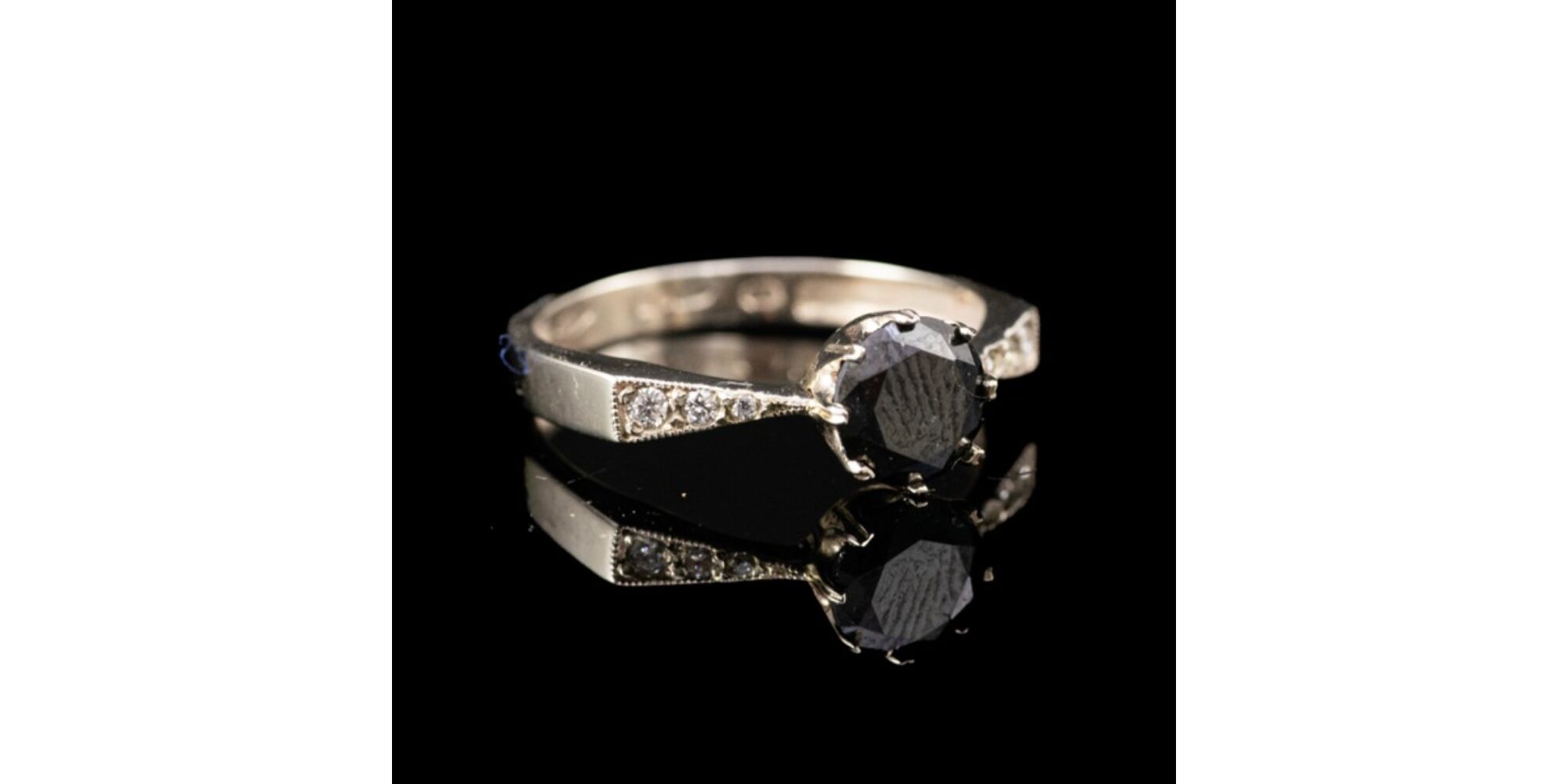 14 karátos fehérarany gyűrűsín, Bruttó tömege: 2,4 gramm. Gyűrűfej közepében karmos foglalatban 1 nagyobb, briliáns formára fazettált feketegyémánt Cca. 1,38 ct; gyűrűvállakon 3-3 apró briliáns csiszolású gyémánt ékítések Cca. 0,06 ct. (M1; W; Vs) Jelzett: 2016-tól használt magyar fémjellel. Gyűrű mérete:54.