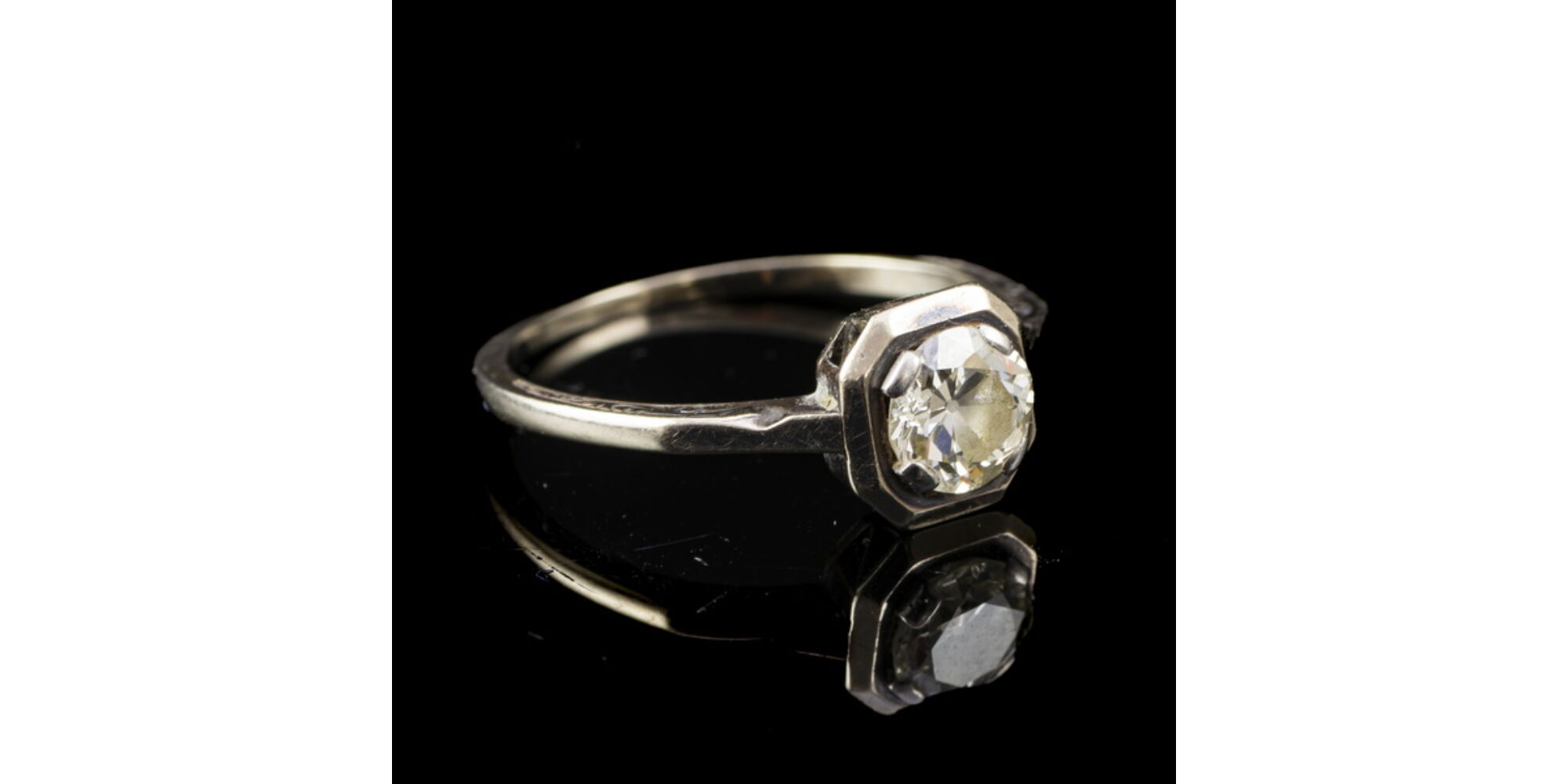 9 karátosra fémjelzett fehérarany szoliter gyűrű, bruttó tömege: 2,28 gramm; nyolcszögletű gyűrűfejben 1 régi briliáns csiszolású gyémánt Cca.0,70 ct (R1;Ly;Si1) Vésett gyűrűvállak. Jelzett: pótlólag fémjelzett modern konvenciós fémjellel. Gyűrű méret: 55.