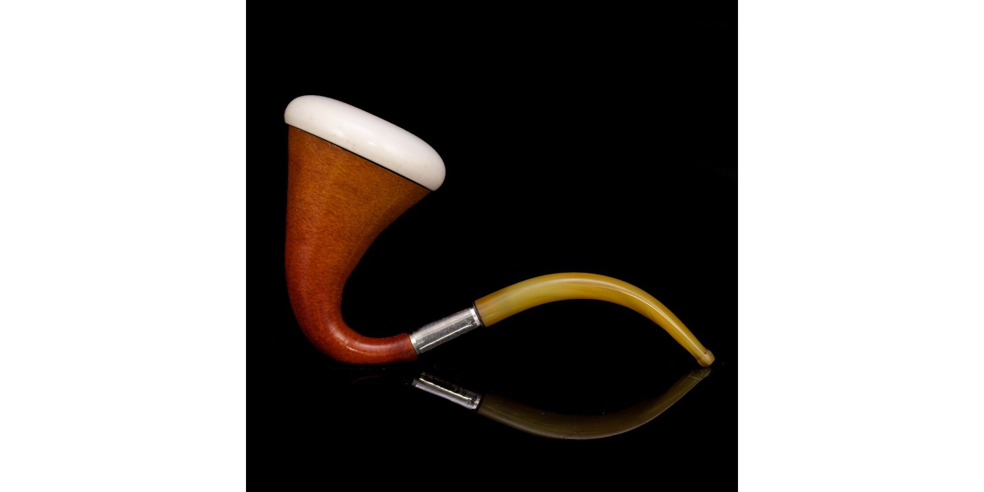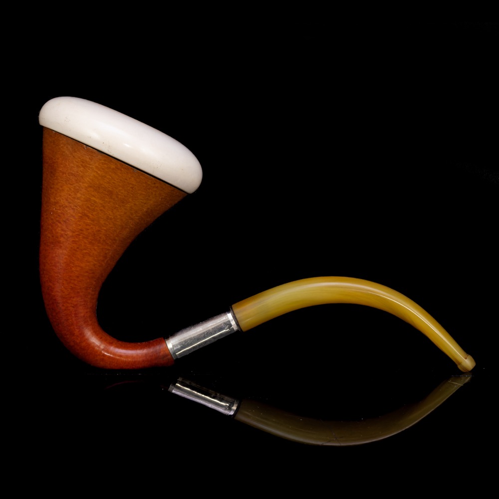 Tanzániai lopótökkel kombinált, esztergált tajték pipafejjel, borostyánt imitáló műanyag szipkával. Méretei:17 x 6 cm. XX. század eleje. Jelzés nélkül.