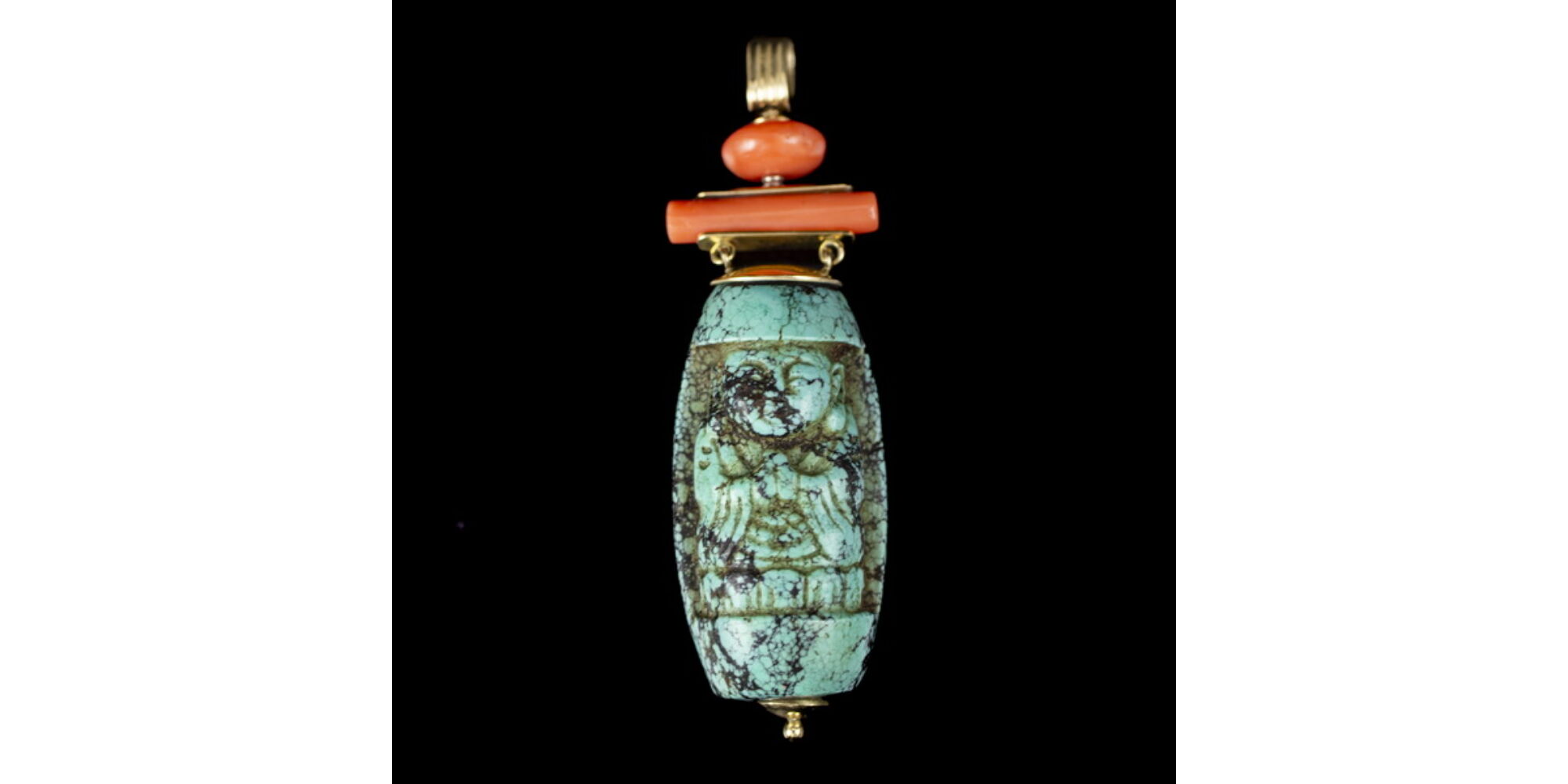 Double-sided, barrel-shaped, hand-carved turquoise stone depicting a Sitting Buddha figure, with 14 K gold fittings and coral additions. Gross weight: 19.74 grams. Marked: Hungarian hallmark used since 2016.