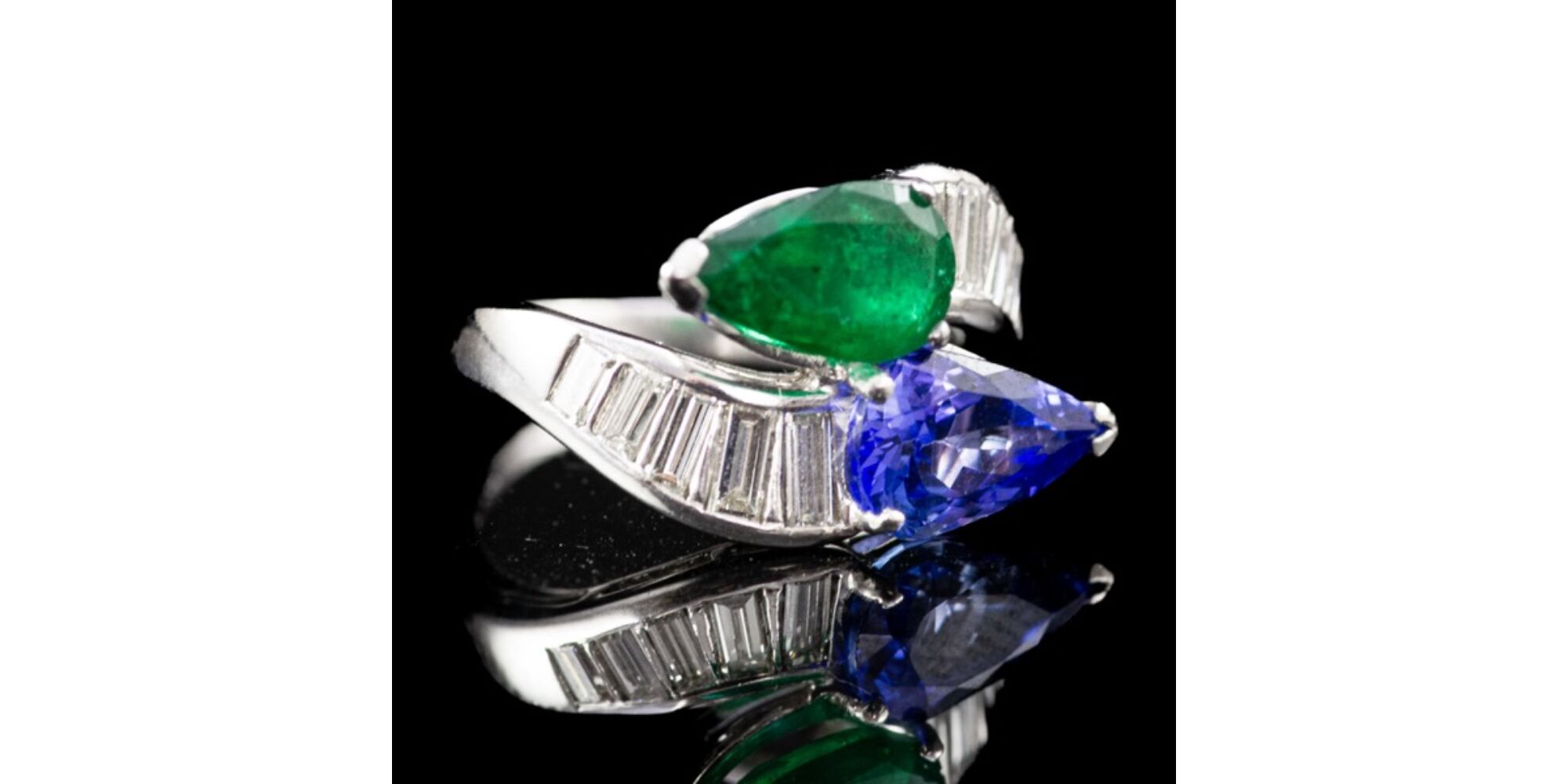 Art Deco-style Toi et Moi-style platinum ring, 900 fineness. In the ring head, 1 teardrop-cut tanzanite approx. 1.5 ct. and 1 teardrop-cut emerald approx. 1.4 ct., as well as 5-5 baguette cut-diamonds approx. 1 ct. (Cr;VVs-Vs). Marked: Hungarian hallmark used from 2016 to the present. Stamped with serial number 1467 inside the ring shank. Ring size: 53.