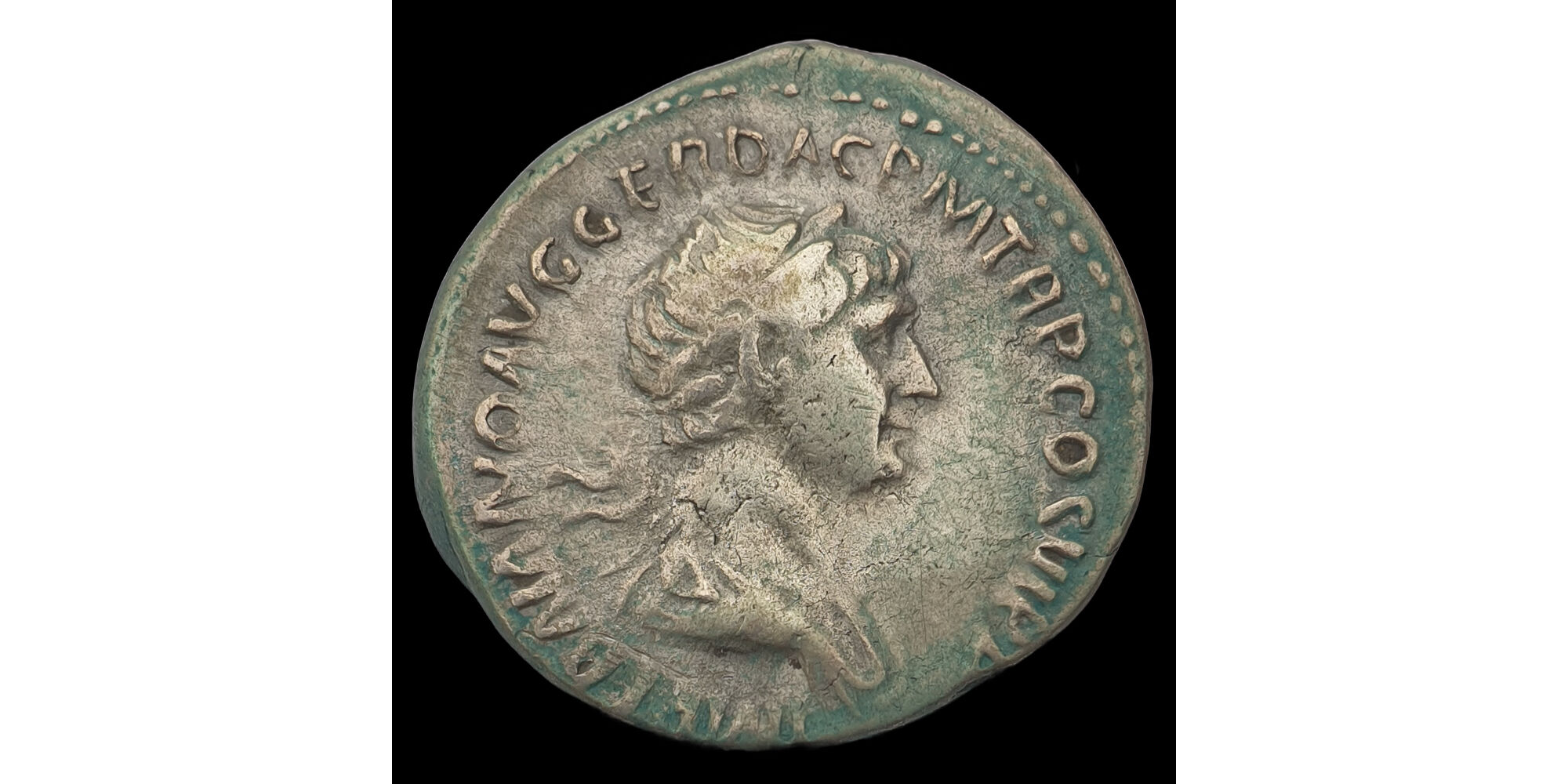 Előlap: IMP TRAIANO AVG GER DAC P M TR P COS VI P P (Traianus jobbra néző babérkoszorús portréja)
