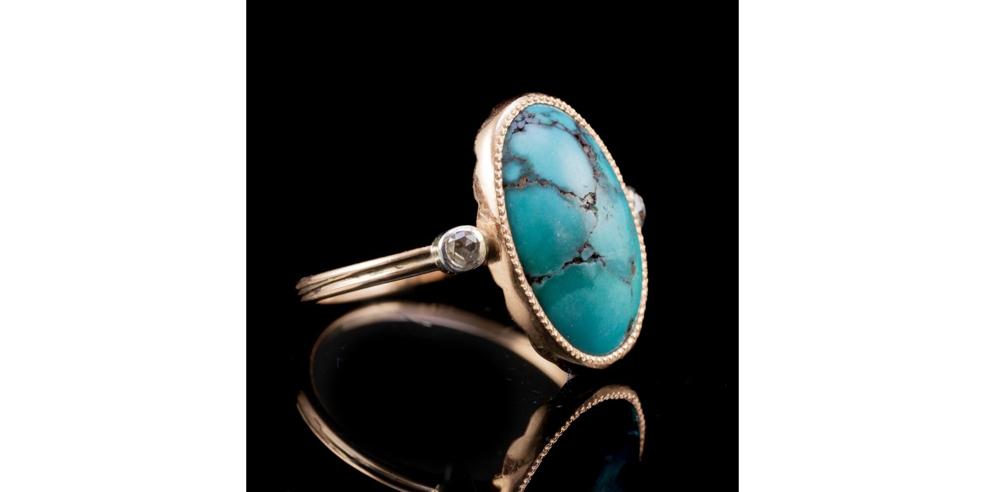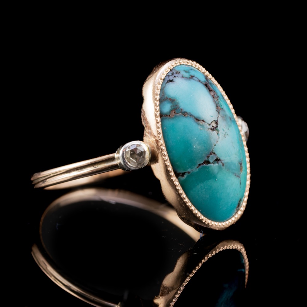 14 karátos női arany gyűrű középen egy ovális türkiz kővel (15 x 9 mm), mellette ezüst foglalatban 1-1 rózsacsiszolt gyémánttal (összesen cca: 0.094 ct). Tömege: 3.6 gramm. Gyűrű mérete: 56. Jelzett: 2016-tól használt belföldi, 585%. ezrelékes arany fémjellel.