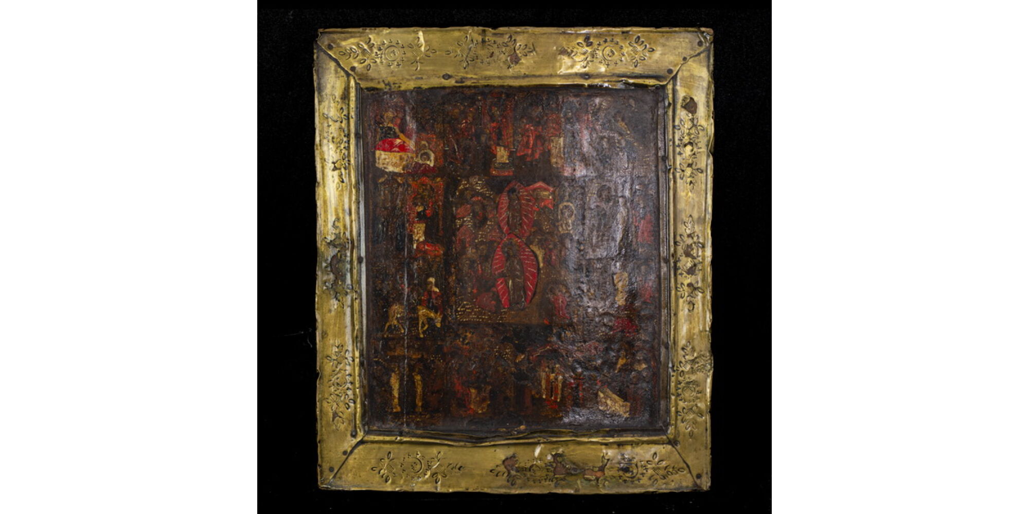 Hand-painted festive icon with 12+1 scenes on a wooden board. Engraved copper barzma (frame). Dimensions: 31.5 x 26.5 cm. End of the 19th century, Russia. Unmarked.