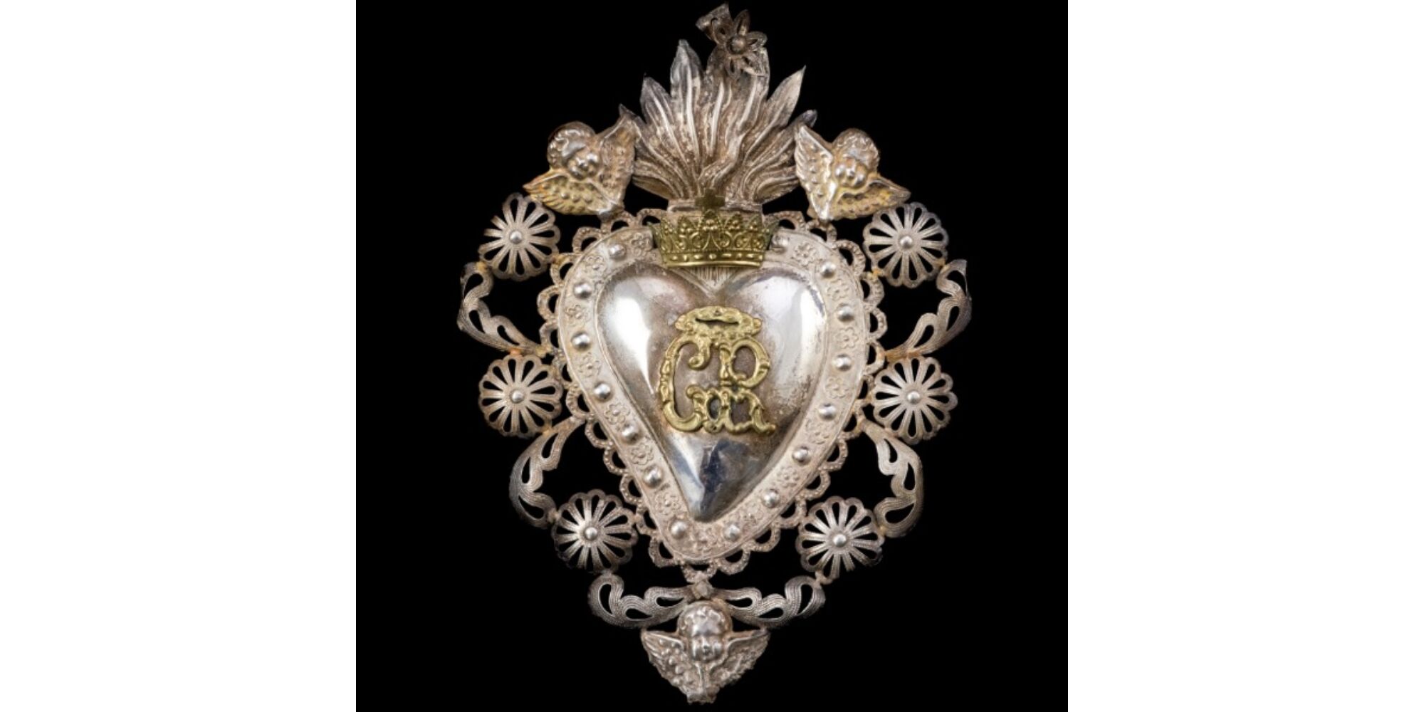 Pressed, antiqued silver heart with openwork rosettes and leaf-like decorations on the sides, flame tongue and angels on top, gilded GR letters (Grazia Ricevuta - Received Grace) applied to the center of the heart. Net weight: 28.9 grams. Dimensions: 20 x 15.5 cm. Mid-19th century.
