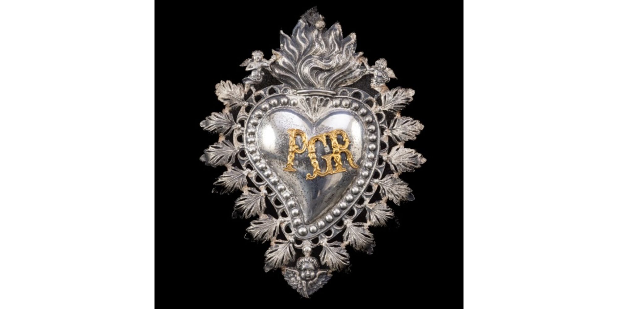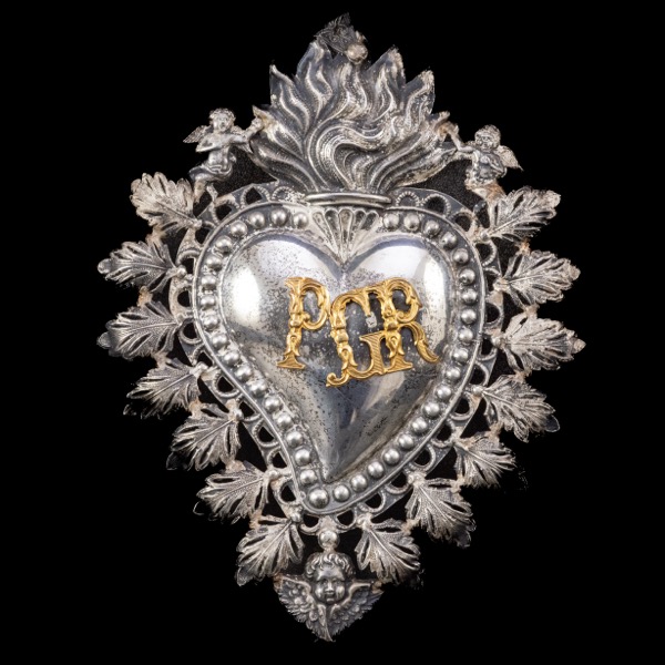 Pressed, antiqued silver heart with flames and angels, gilded PGR letters (Per Grazia Ricevuta - Received Grace) applied to the center of the heart. Net weight: 32.83 grams. Dimensions: 20 x 15.5 cm. Mid-19th century.