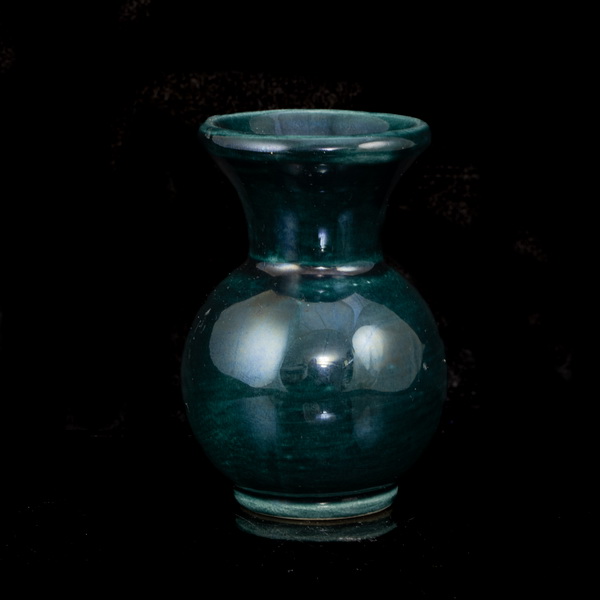 Kerek formájú, korongolt testű, zöldeskék mázas Zsolnay kerámia kisváza, méretei: 9 x d:6,5 cm. Jelzett: XX. század közepe domború öttemplomos Zsolnay márkajelzéssel.
