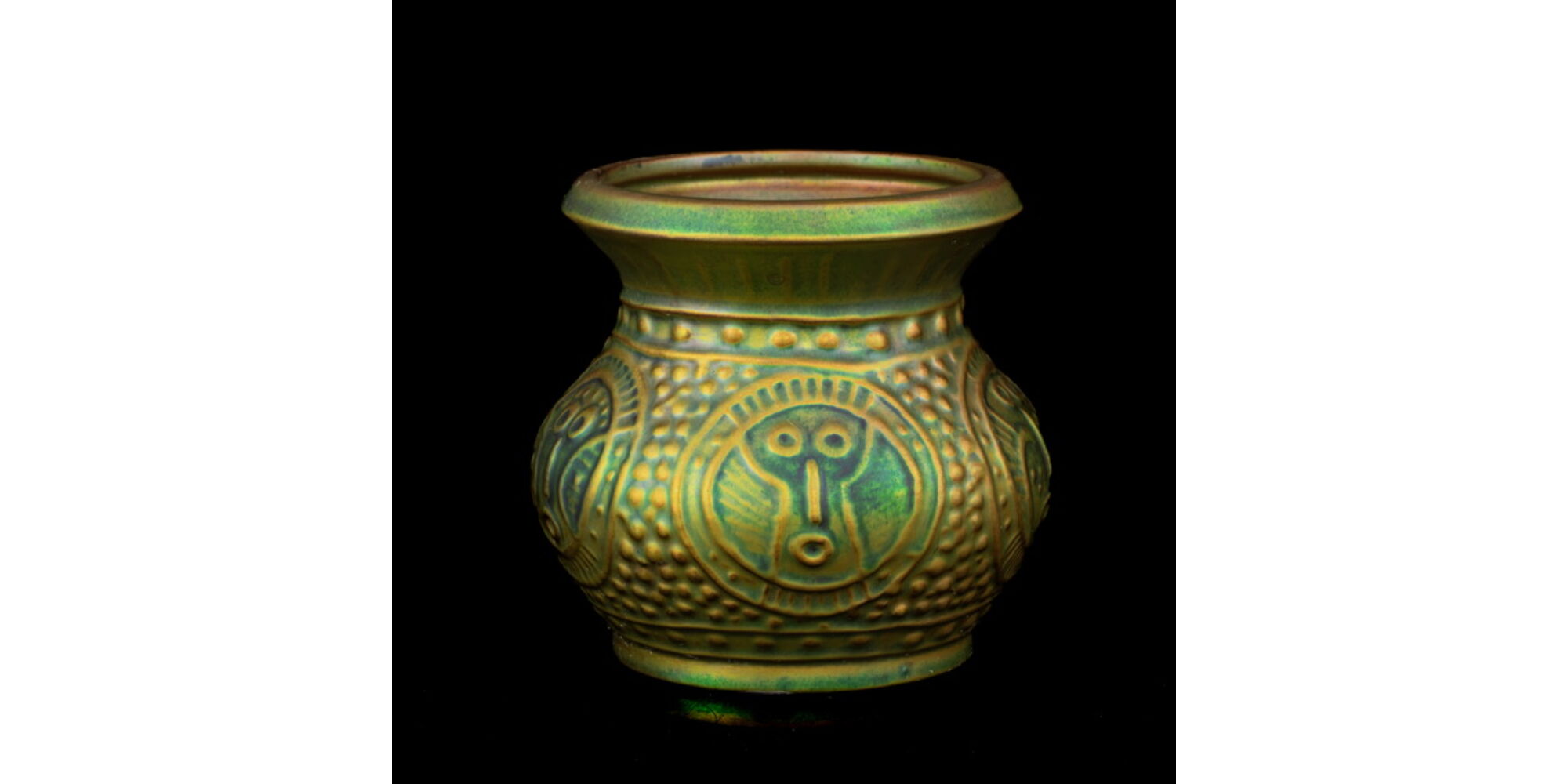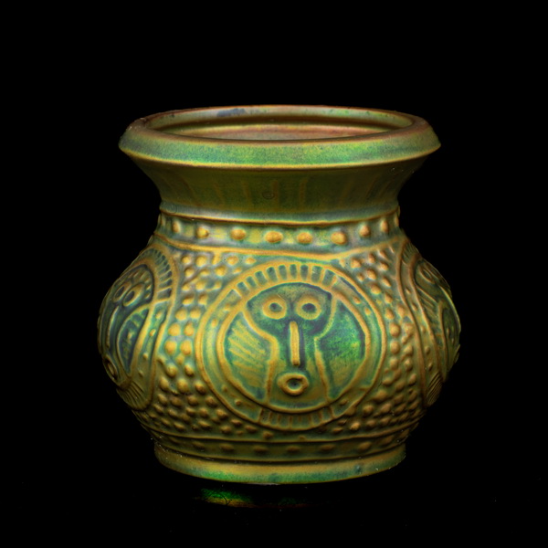 Zöld eozin mázas porcelán kisváza, dombornyomott busómaszkos mintázattal. Méretei: 8 x d:8,5 cm. Jelzett: 1930 körüli hárompajzsos Zsolnay márkajelzéssel.