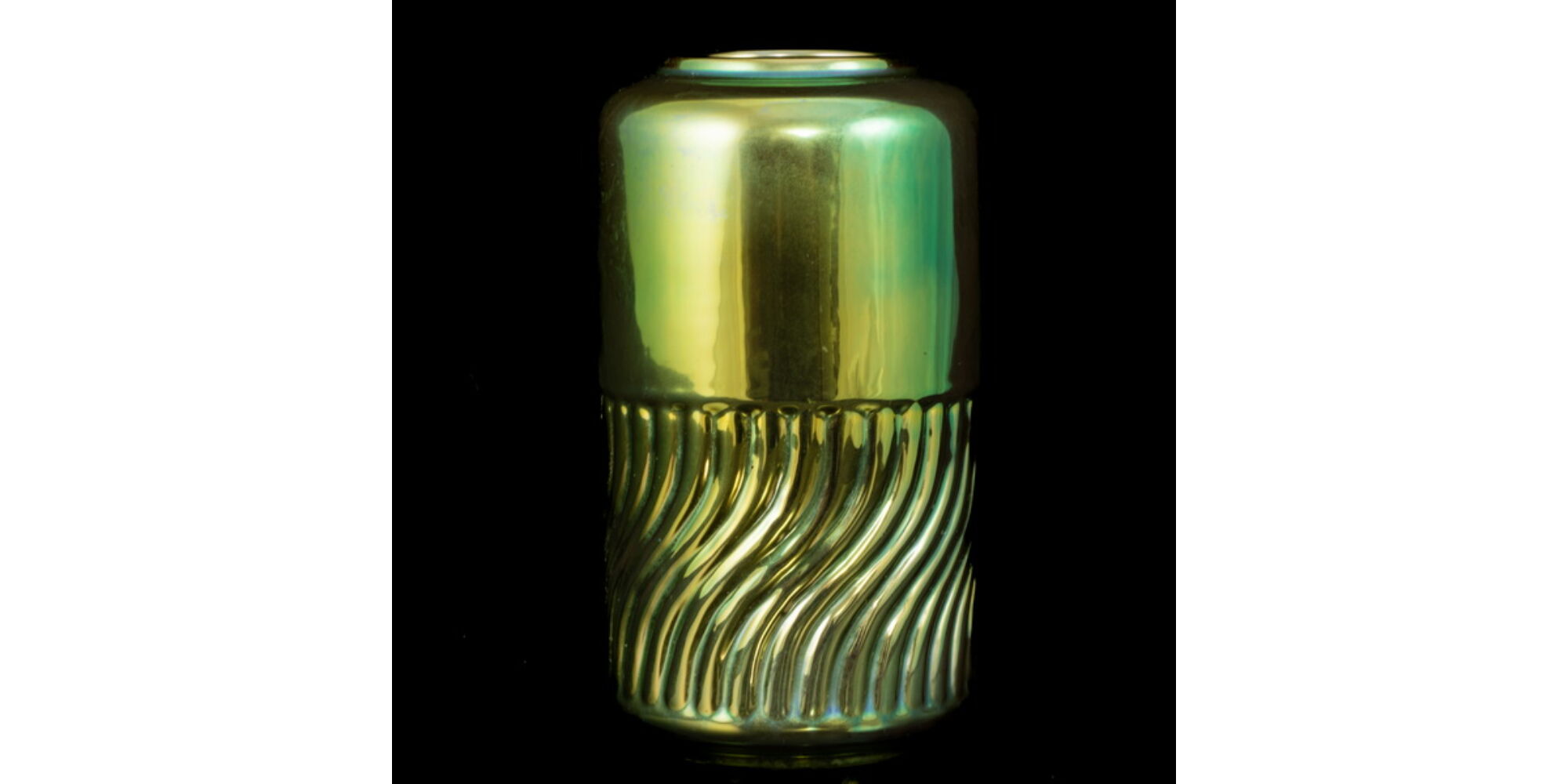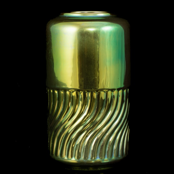 Zöld eozin mázas porcelán váza, henger formájú, dombornyomott csavart mintázattal. Méretei: 17 x d:9,5 cm. Jelzett: modern Zsolnay márkajelzéssel.