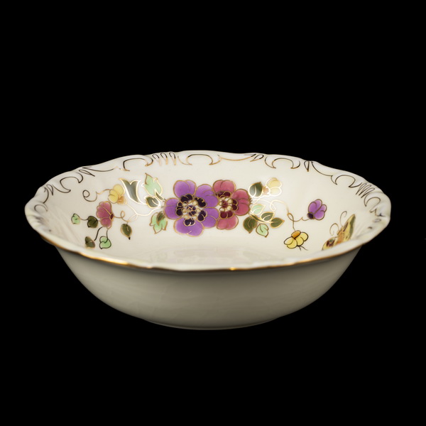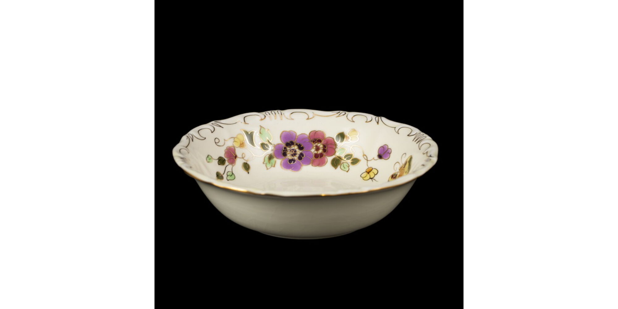 Zsolnay porcelain compote bowl painted with butterfly decor and gold-contoured. Dimensions: 4 x d:13 cm. Marked: modern Zsolnay brand mark.