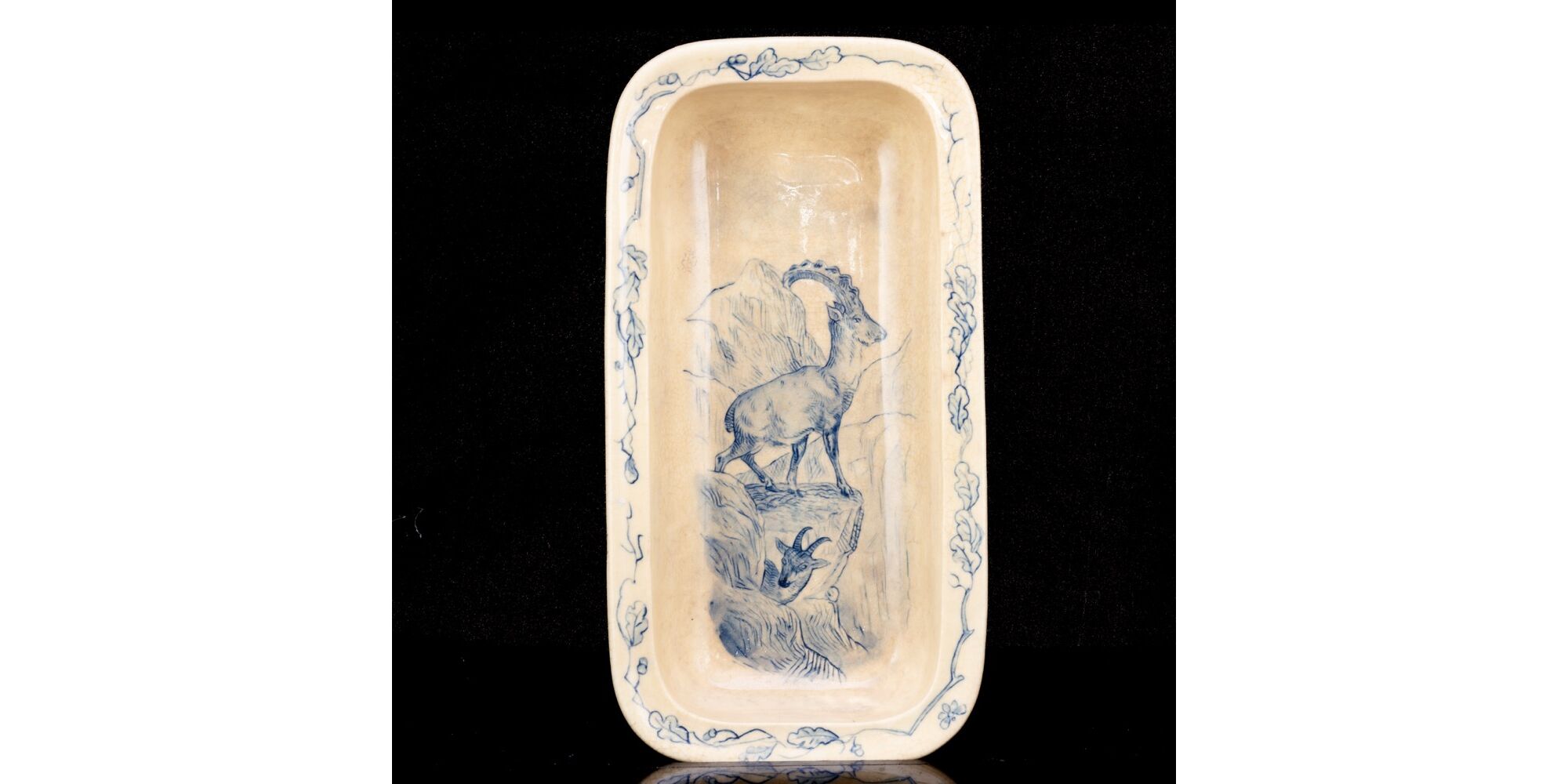 Festett, mázas Zsolnay fajansz, lekerekített sarkú téglatest formájú tálka, tükrében kékkel festett kőszári kecskékkel. Méretei: 5 x 25,5 x 13,5 cm. Zsolnay, Pécs, 1880-1900 körüli. Jelzett: Masszába nyomott Zsolnay Pécs, 306 formaszámmal.
