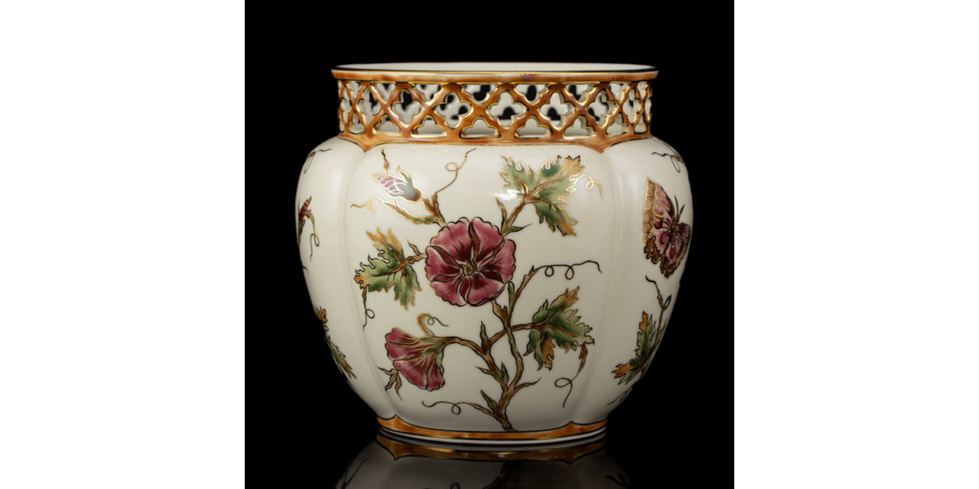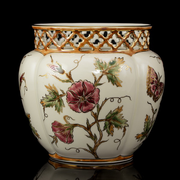 Áttört peremmel készült, aranykontúrozott, festett, mázas Zsolnay porcelán kaspó, méretei: 18,5 x 20,5 cm. Jelzett: Modern Zsolnay márkajelzéssel, valamint 1064/11/2253 Moldán M jelzéssel.